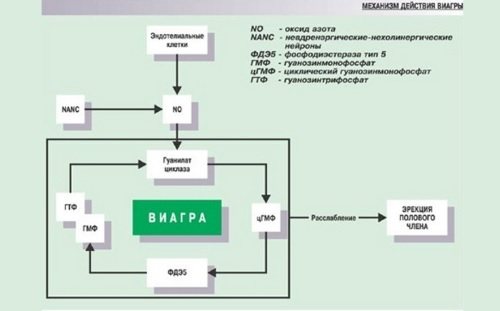 Способ и механизм воздействия связан с высвобождением азота (его окиси) и раздражением кавернозного тела. Их гладкие мышцы расслабляются, приток крови увеличивается, как повышается и уровень ЦГМФ. Это расслабляющее воздействие таблетки связано не с прямым действием Виагры, а с усилением влияния оксида азота на выработку фосфодиэстеразы. Для того чтобы состав медикамента начал действовать, требуется сексуальная стимуляция.